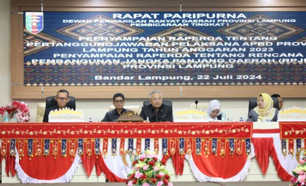 Bandar Lampung – Pj. Gubernur Lampung Samsudin, diwakili Sekretaris Daerah Provinsi (Sekdaprov) Lampung Fahrizal Darminto, menyampaikan Rancangan Peraturan Daerah (Raperda) tentang Rencana Pembangunan Jangka Panjang Daerah (RPJPD) Provinsi Lampung Tahun 2025-2045, di Ruang Sidang DPRD Provinsi Lampung, Senin (22/07/2024).