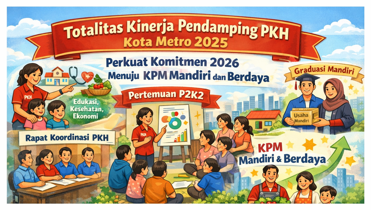 Kota Metro – Kinerja Pendamping Program Keluarga Harapan (PKH) se-Kota Metro sepanjang tahun 2025 menunjukkan capaian yang solid, konsisten, dan berdampak nyata. Pendamping PKH tidak hanya menjalankan fungsi pendampingan bantuan sosial, tetapi hadir sebagai penggerak perubahan sosial yang memastikan Keluarga Penerima Manfaat (KPM) tumbuh menuju kemandirian dan keberdayaan.